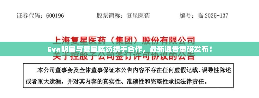 好啦,别猜了,让我来给你们详细解读一下这个最新通告吧,Eva明星团队和复星医药共同宣布了一项重要合作,双方将携手推出全新的健康产业项目,这次合作可谓是跨界联手,Eva明星的影响力加上复星医药的专业实力,一定会掀起一股健康热潮。