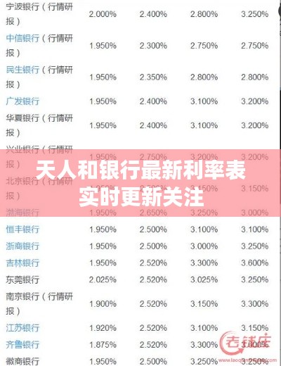 实时关注天人和银行的最新利率表,对于每个人来说都具有重要意义,我们应该通过多种渠道获取最新的利率信息,并根据实际情况做出相应的理财规划、投资决策和消费决策,我们也要保持理性,避免因为过度追求高收益或低成本而忽略风险,希望本文能为大家带来有用的信息和启示。